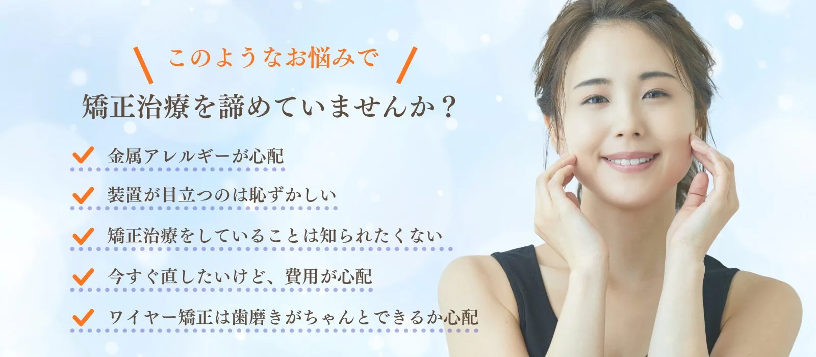 メタルフリーなので、金属アレルギーがあっても安心して矯正治療を受けることができます。